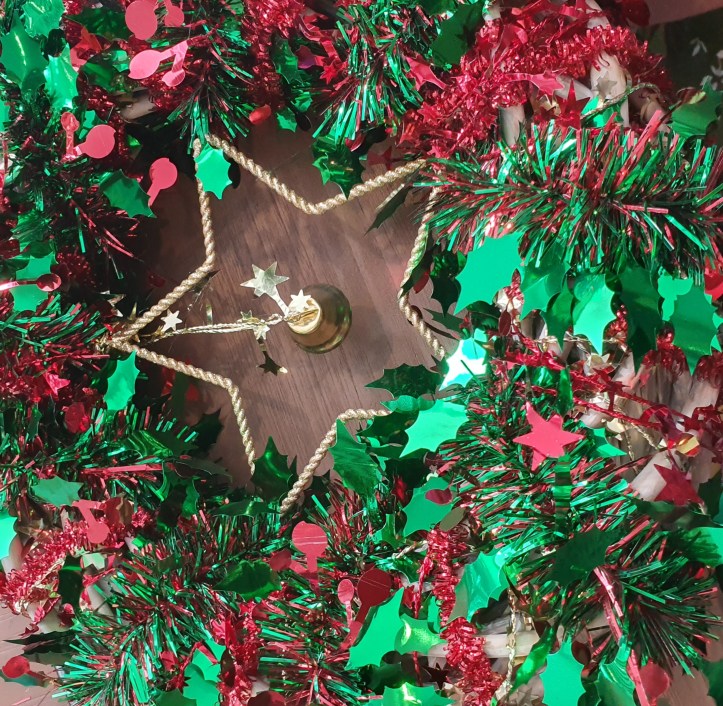 - A Christmas wreath embellished with tinsel, a star and a bell
