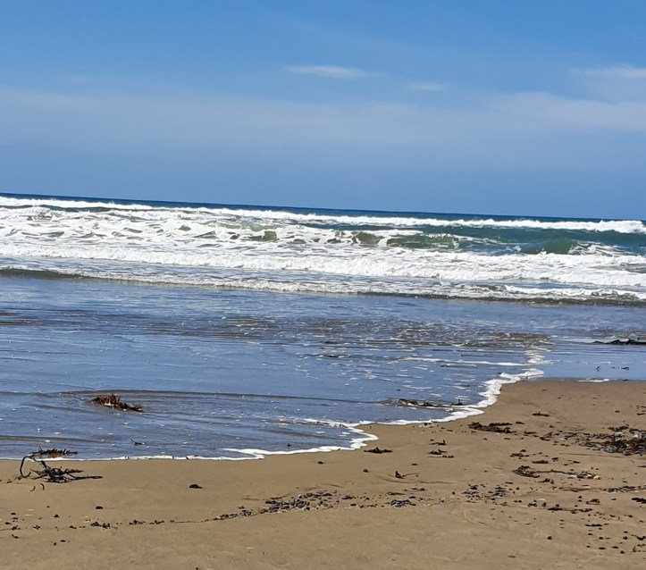 The water before me appears as a mix of blues displayed in an Ombré effect, graduating from deep navy at the horizon and includes shades of marine, aqua and cobalt blue. Closer to the shore, shadows from rocks incrusted with shellfish and wrapped within long strands of dark seaweed tentacles that dance in the currents, taint the blues to add a murky brown tinge to the mix. The chroma of the Pacific Ocean that extends before me this evening is dulled under the greying sky, there is a sense of calm as the water resembles a lake with slight ripples and waves gently lapping at the shore.