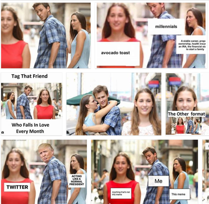 Maybe an example will help? The image ‘distracted boyfriend’ by Spanish photographer Antonio Guillem went viral in 2007 with suggestive text embellishments. In additional to thousands of images based on the original photograph, this meme also includes duplicating the original image with substitution of one or all participant. The image below is a very small sample from google images, I like the Donald Trump example.