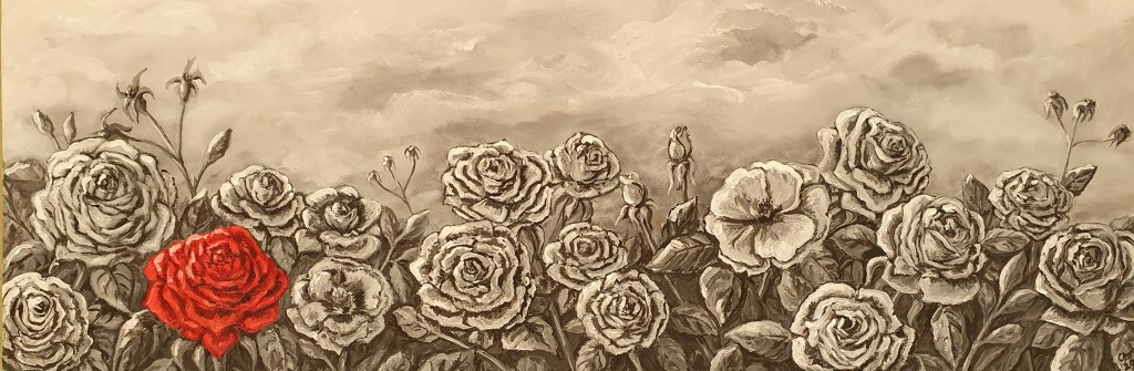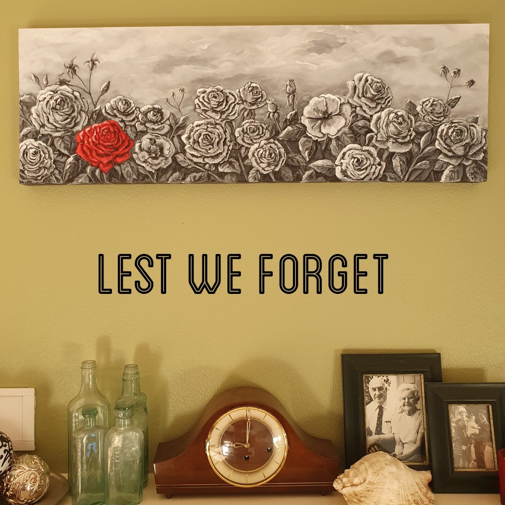 Before we moved to lockdown I bought a canvas to make use of some of the time to reengage with one of my passions, painting. I envisioned a black and white canvas of roses with one red rose. Now a month on I have almost finished the painting and although not intended originally to represent anything, on reflection how appropriate this is given the fact that it is almost Anzac Day; a day where we wear a red poppy to signify our fallen soldiers who went to war or server at home to protect our freedom. This year we are all protecting our shores. This painting will now signify those that we have lost to Covid19 and represent Anzac Day.
